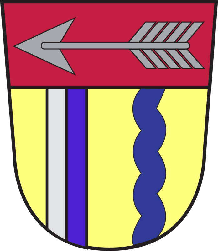 „Unter rotem Schildhaupt, darin ein waagrechter silberner Pfeil, in Gold rechts ein von Silber und Blau gespaltener Pfahl, links ein blauer Wellenpfahl“
